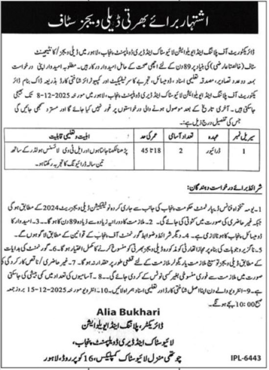Livestock And Dairy Development Jobs in Lahore are a great chance for people who want a safe and steady government job in Punjab. These jobs are announced in the Jang newspaper on 20 November 2025, and the department is looking for hardworking people who can support their daily operations. One of the main posts open this year is the driver job. The department has simple requirements, and anyone with Primary or Middle education can apply. The job is full-time, and it is based in Lahore.